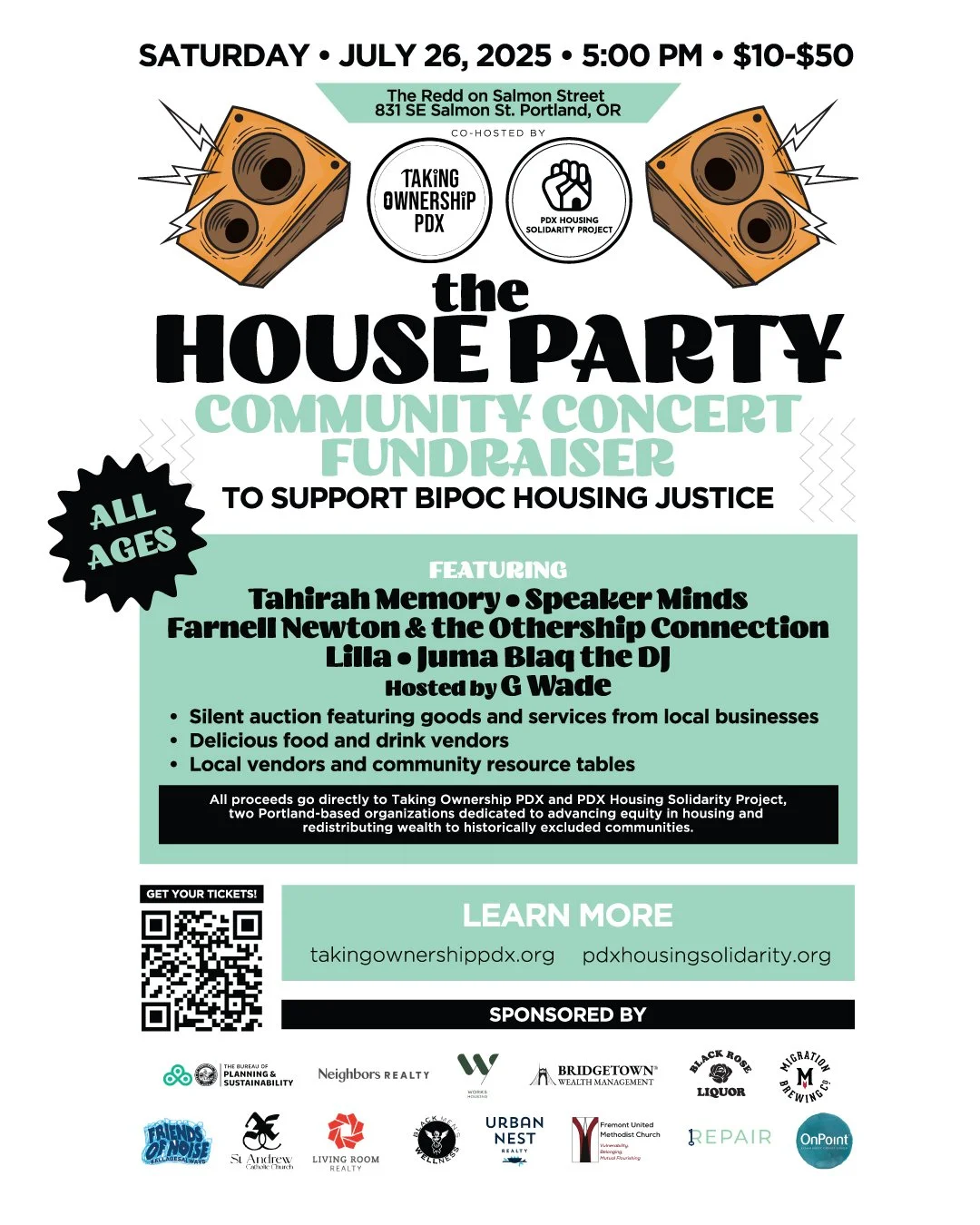 On July 26 2025 PDX Housing Solidarity Project and Taking Ownership hosted our first fundraiser! It was a powerful evening of music, community, and collective action, raising our voices—and vital funds—to support housing justice for Black, Indigenous, and communities of color in Portland.